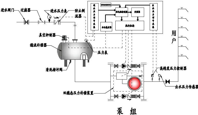 另外如設(shè)備原理圖所示,通過微機控制、雙穩(wěn)態(tài)壓力補償裝置及真空補償系統(tǒng),使本設(shè)備可以和自來水直接串接,因水泵工作的疊加原理,使設(shè)備可以充分利用自來水原有的壓力,增加了變頻調(diào)速給水設(shè)備的節(jié)能點。當自來水壓力不足致使壓力下降時,本設(shè)備通過真空抑制器及穩(wěn)流補償器中的檢測裝置采集穩(wěn)流補償器內(nèi)的水位信號,通過微機控制真空抑制器及雙穩(wěn)態(tài)壓力補償裝置中的的特殊裝置動作,抑制負壓的產(chǎn)生,保證設(shè)備不對城市管網(wǎng)產(chǎn)生任何影響。