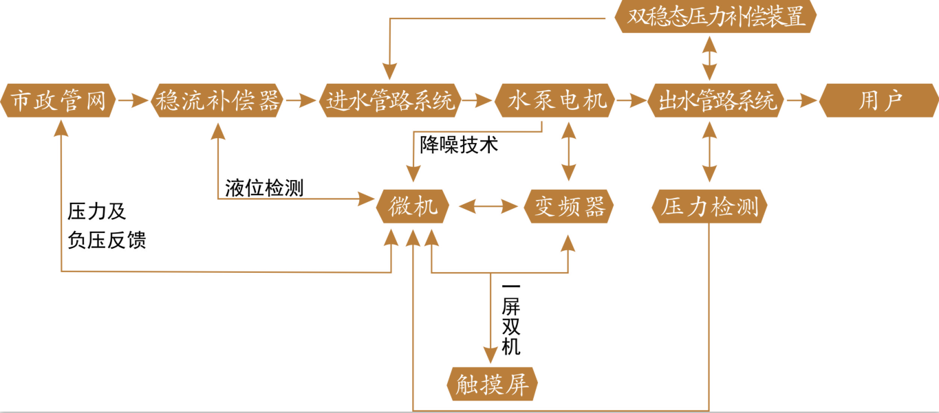 無負壓供水設(shè)備采用微機變頻技術(shù)、降噪技術(shù)、一屏雙機技術(shù)、雙穩(wěn)態(tài)壓力補償技術(shù)、負壓處理技術(shù)實現(xiàn)無負壓供水。通過觸摸屏顯示運行狀態(tài),通過微機控制、雙穩(wěn)態(tài)壓補償裝置及真空補償系統(tǒng),實現(xiàn)了與自來水管網(wǎng)直接串接,并且克服了對管網(wǎng)的不良影響。